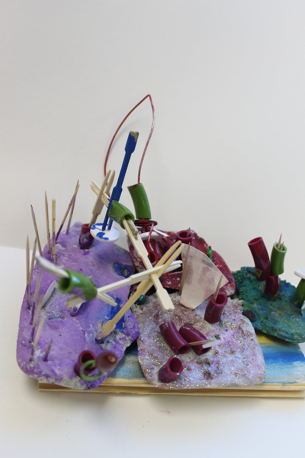 I try to vary my lessons a lot between learning "skills" and letting the kids just "play" with materials. Art is much more investigation than it is following rules!! So for my sculpture enrichment students this past semester, I gave them Styrofoam plates, cement (I poured) and a ton of STUFF. There were no rules, no instructions, no reference points, nothing ;).